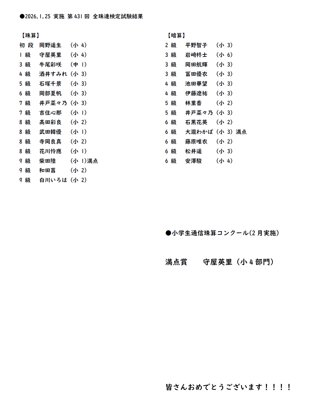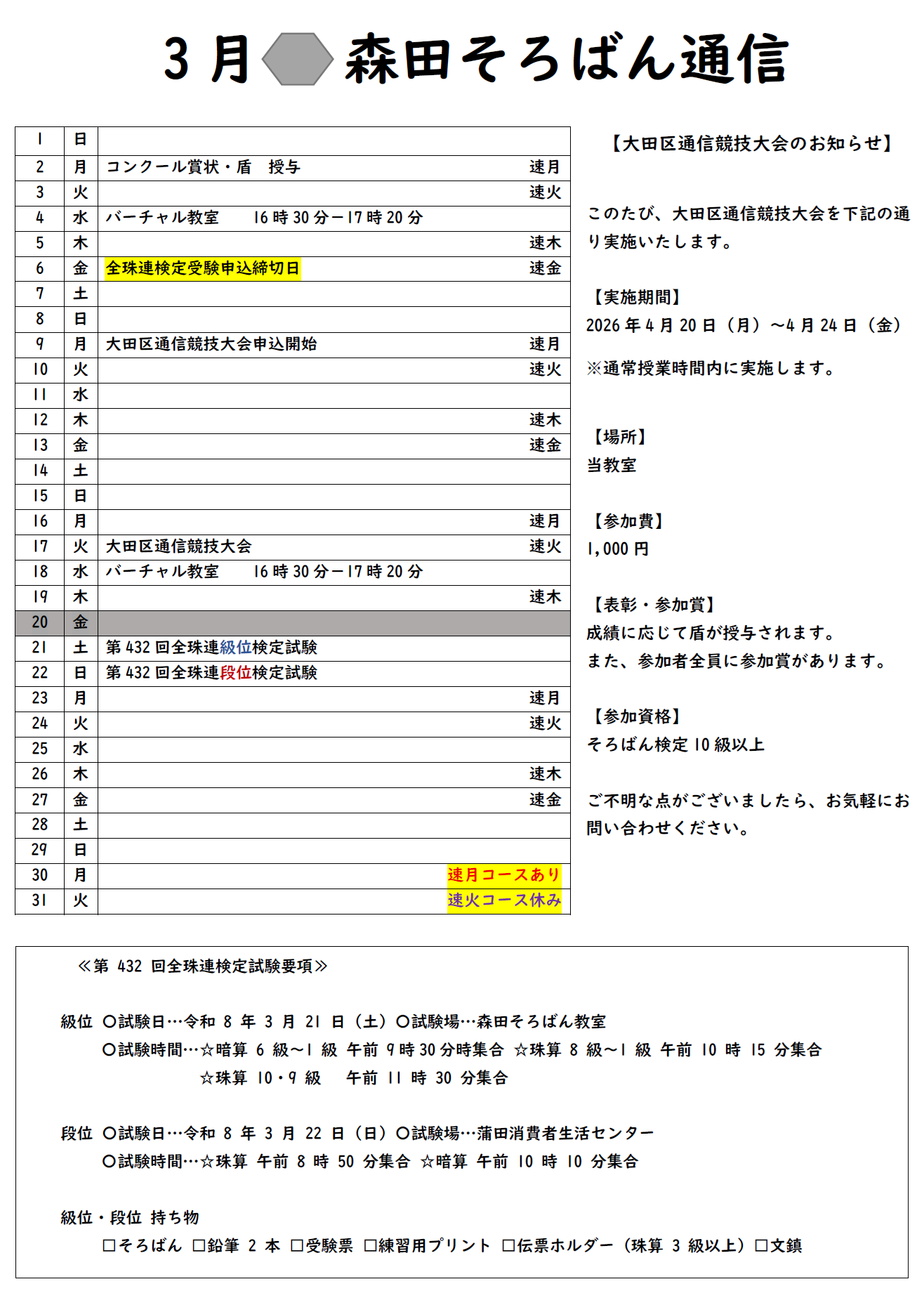 Let’s Try Soroban & Anzan! ー 入学案内 - 全国珠算教育連盟 正会員指導教場そろばん無料体験学習受付中!お気軽にお問い合わせください。 森田そろばん教室は昭和34年に先代の父が開塾したそろばん教室です。上級、段位を多数輩出した先代のノウハウを受け継ぐとともに、暗算力アップにつながるソロバンのやり方を独自に研究。2019年9月に開塾以来、早くも珠算、暗算ともに上級検定合格者多数。 森田そろばん教室 矢口渡教室 住 所東京都大田区多摩川1-3-6 最寄駅大田区:矢口渡駅より徒歩5分 通 学自転車通学可/送迎用駐車場(近隣にコインパーキングあり)