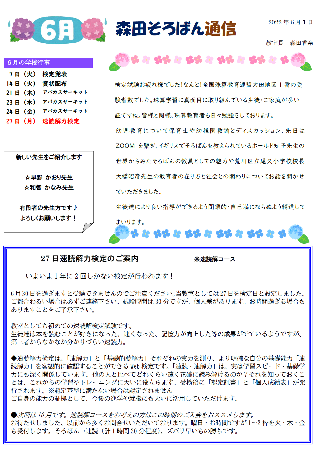 森田そろばん教室は昭和34年に先代の父が開塾したそろばん教室です。上級、段位を多数輩出した先代のノウハウを受け継ぐとともに、暗算力アップにつながるソロバンのやり方を独自に研究。2019年9月に開塾以来、早くも珠算、暗算ともに上級検定合格者多数。