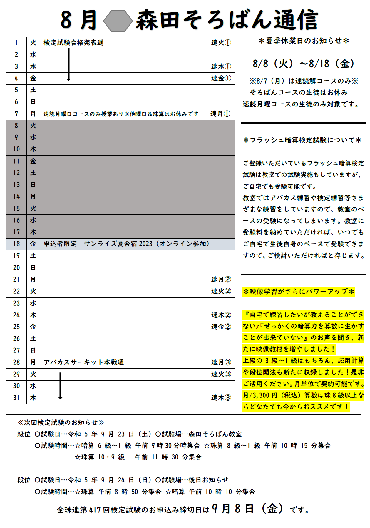 森田そろばん教室は昭和34年に先代の父が開塾したそろばん教室です。上級、段位を多数輩出した先代のノウハウを受け継ぐとともに、暗算力アップにつながるソロバンのやり方を独自に研究。2019年9月に開塾以来、早くも珠算、暗算ともに上級検定合格者多数。