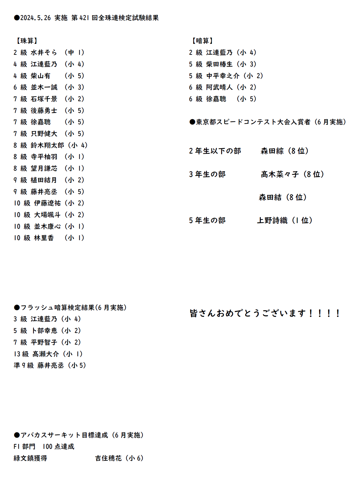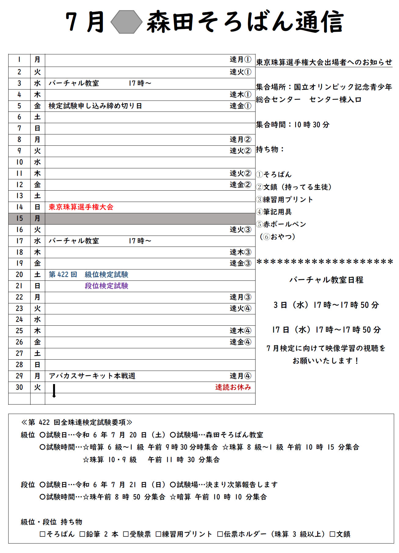 Let’s Try Soroban & Anzan! ー 入学案内 - 全国珠算教育連盟 正会員指導教場そろばん無料体験学習受付中!お気軽にお問い合わせください。 森田そろばん教室は昭和34年に先代の父が開塾したそろばん教室です。上級、段位を多数輩出した先代のノウハウを受け継ぐとともに、暗算力アップにつながるソロバンのやり方を独自に研究。2019年9月に開塾以来、早くも珠算、暗算ともに上級検定合格者多数。 森田そろばん教室 矢口渡教室 住 所東京都大田区多摩川1-3-6 最寄駅大田区:矢口渡駅より徒歩5分 通 学自転車通学可/送迎用駐車場(近隣にコインパーキングあり)