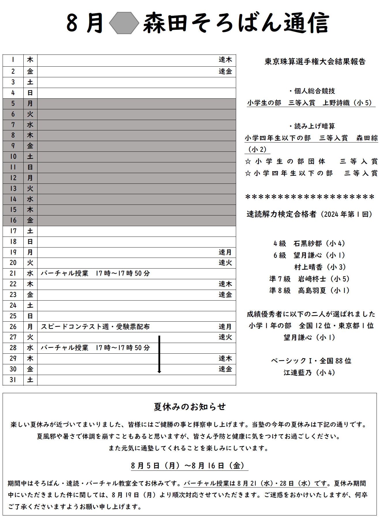 Let’s Try Soroban & Anzan! ー 入学案内 - 全国珠算教育連盟 正会員指導教場そろばん無料体験学習受付中!お気軽にお問い合わせください。 森田そろばん教室は昭和34年に先代の父が開塾したそろばん教室です。上級、段位を多数輩出した先代のノウハウを受け継ぐとともに、暗算力アップにつながるソロバンのやり方を独自に研究。2019年9月に開塾以来、早くも珠算、暗算ともに上級検定合格者多数。 森田そろばん教室 矢口渡教室 住 所東京都大田区多摩川1-3-6 最寄駅大田区:矢口渡駅より徒歩5分 通 学自転車通学可/送迎用駐車場(近隣にコインパーキングあり)