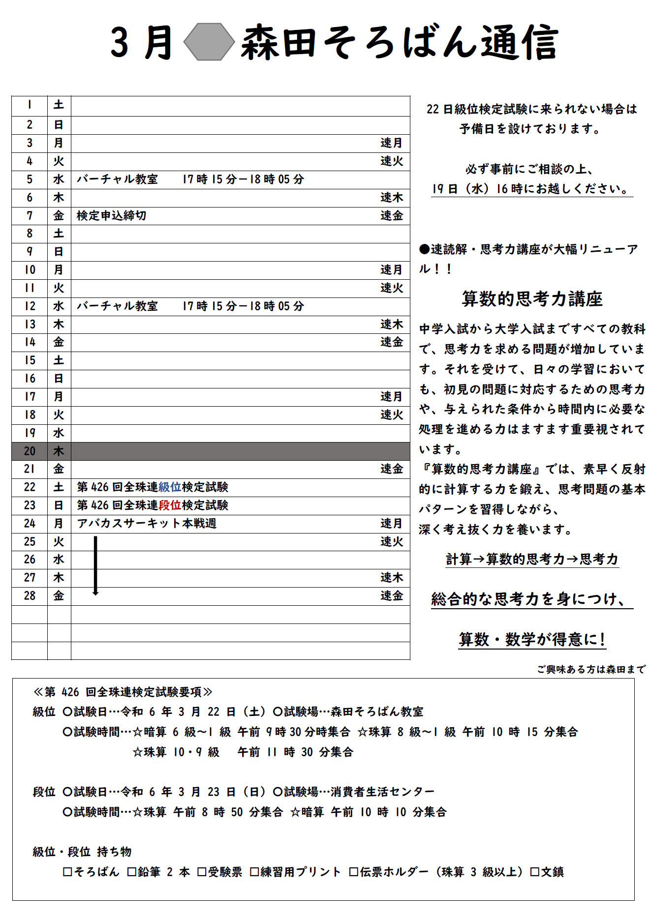 森田そろばん教室は昭和34年に先代の父が開塾したそろばん教室です。上級、段位を多数輩出した先代のノウハウを受け継ぐとともに、暗算力アップにつながるソロバンのやり方を独自に研究。2019年9月に開塾以来、早くも珠算、暗算ともに上級検定合格者多数。